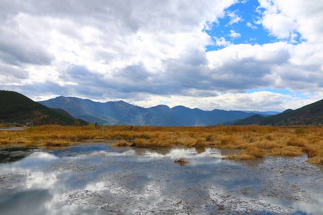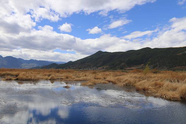 桥两侧长有茂密的芦苇,远远望去千层麦浪,不断翻腾,像娇羞的少女,摇坠在水中央。秋天的草海秋意盎然,置身其中,犹如一幅水彩画。
