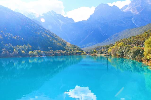 蓝月谷位于雪山脚下,真的太美,近处水轻清的可以见底,远的地方那是碧绿的颜色,就犹如天上掉下的翡翠一样。天公很作美,蓝天白云给景色增添了更多的美,构成一幅幅美丽的画卷。