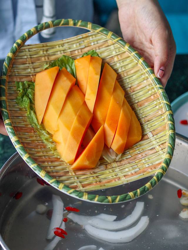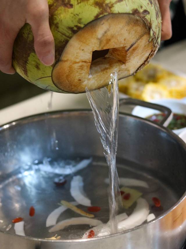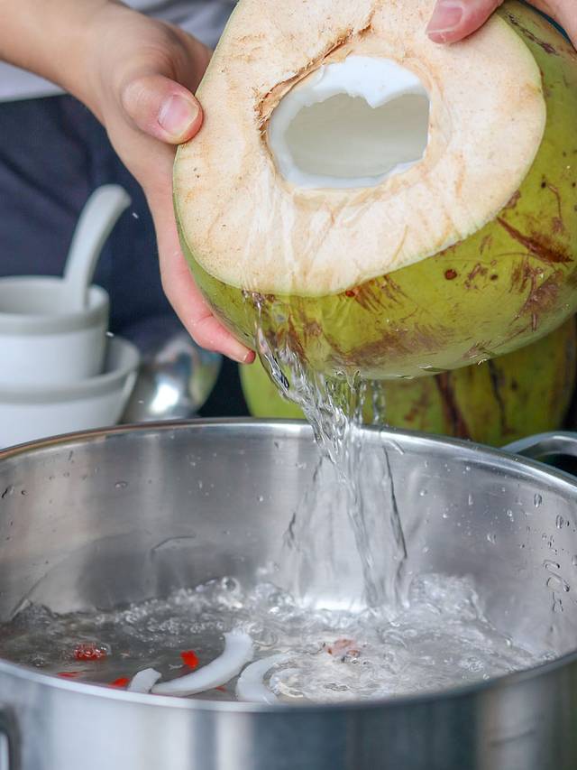 椰子鸡的锅底都是新鲜制作,服务员现场往锅里加入三个椰子汁,锅底里面放入了很多配菜,马蹄,椰肉之类的,一定要先喝上一碗热汤,香甜可口~