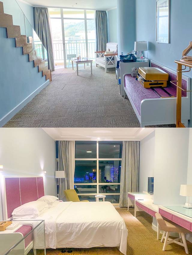 银泰是三亚老牌的五星酒店了,酒店设施齐全,房间特别大~我们选择的是复式loft,蓝白色调的房间还有几分地中海小清新的感觉。两层房间都可以看到海,拉开窗帘的那一瞬间,所有的疲倦一扫而光~
