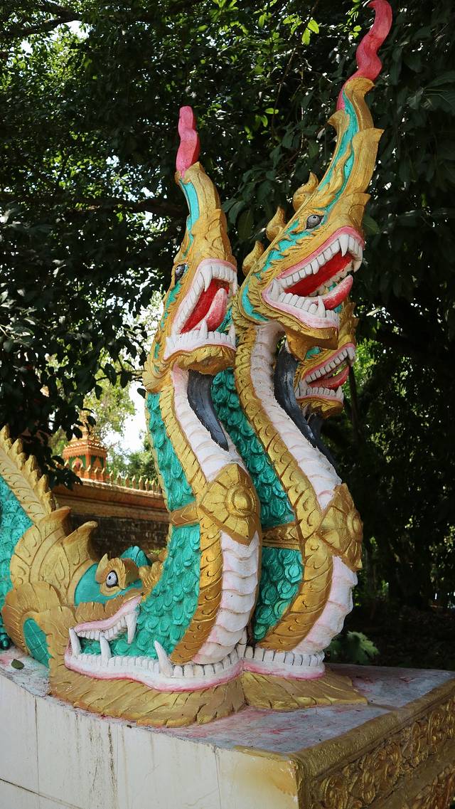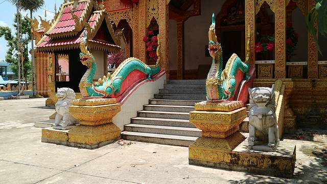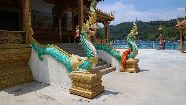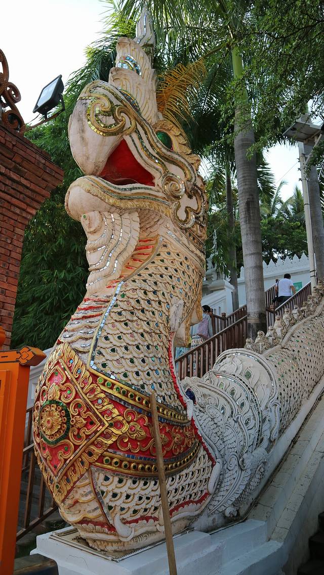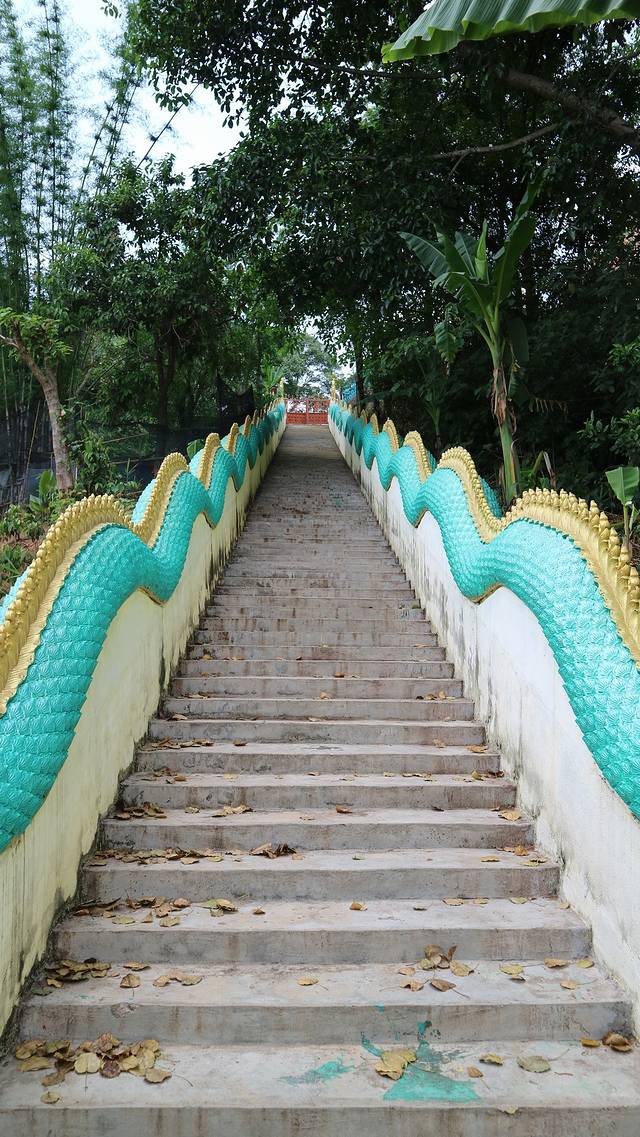 曼召寺在一个小山之上,拾级而上,才能够欣赏到她的全貌,而这个台阶两边修以巨龙,形态和清迈的素贴寺有着异曲同功之妙。