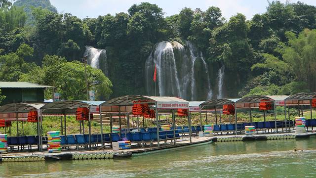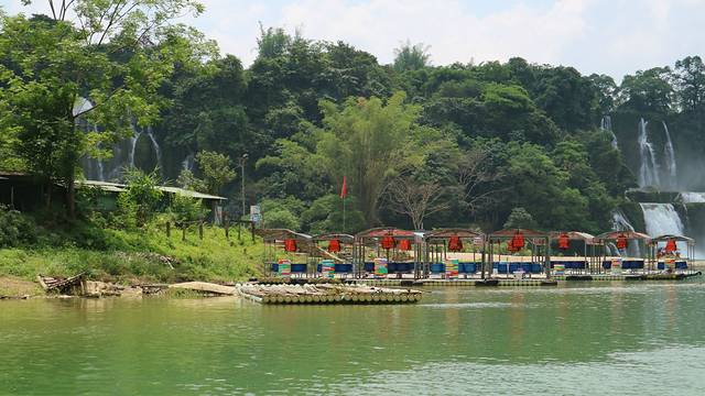 面前的这个小小的瀑布,和这些游船,都是属于越南的,不过和中国比起来,越南那一边明显没有什么游客,只有三两个船夫在树下躲阴凉。