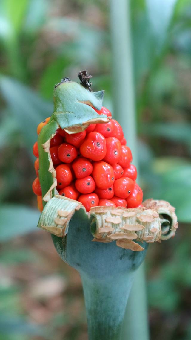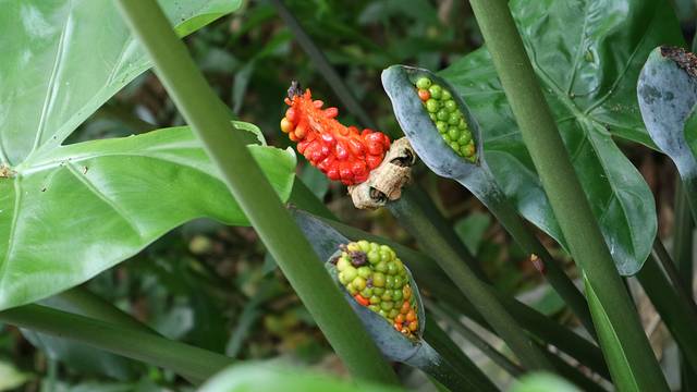 这里的滴水观音、龟背竹都吸收了天地精华,长的非常壮硕,滴水观音还长出了如石榴籽般的果实,分外可爱。