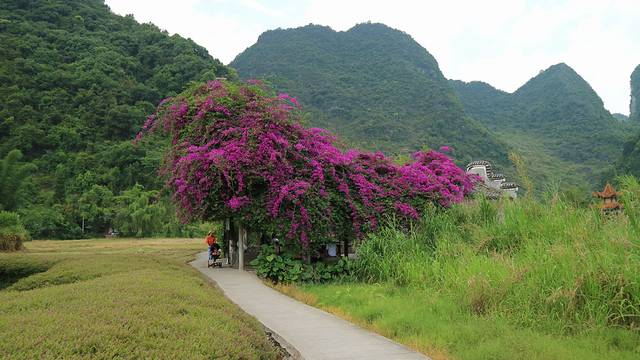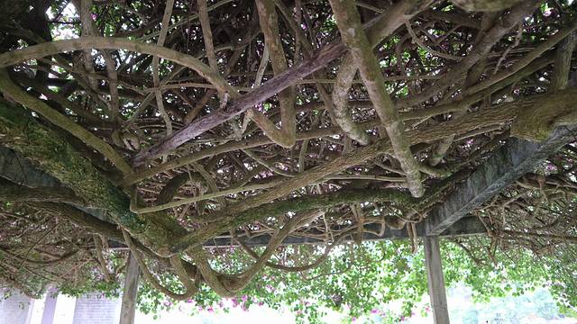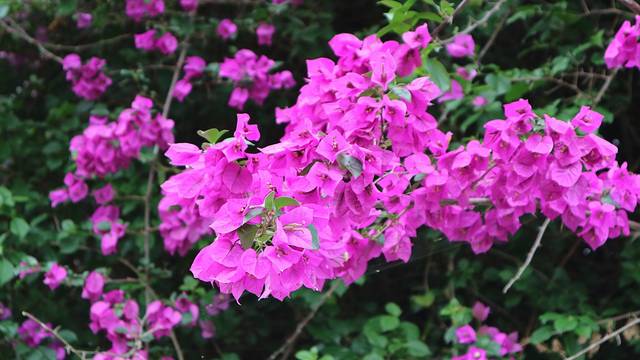 一个小亭子里,满头的三角梅正在盛放,盘根错节的枝条布满了天花板。