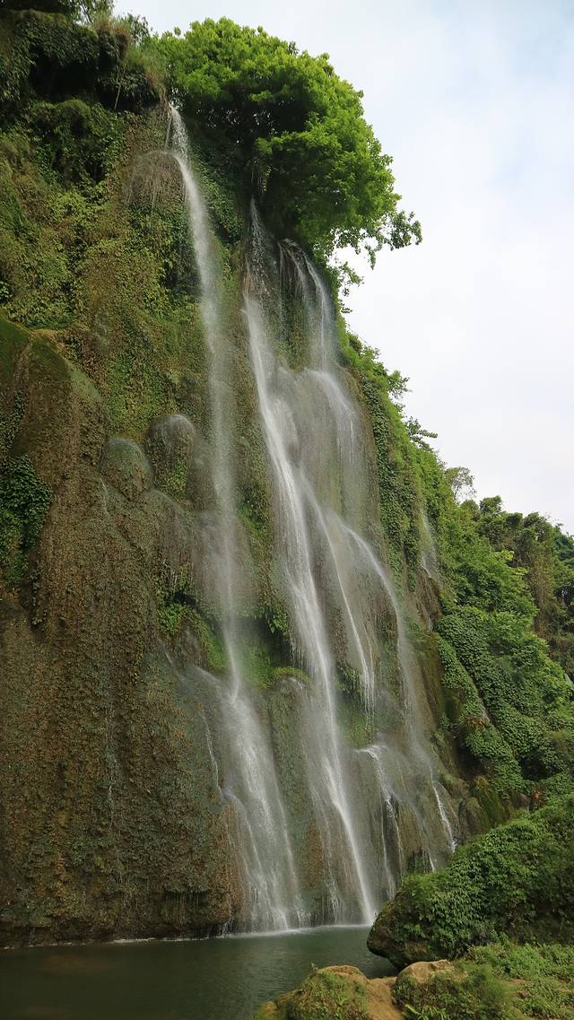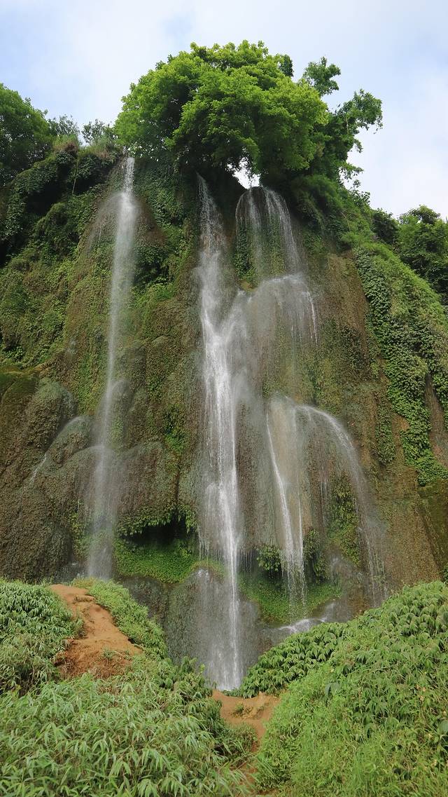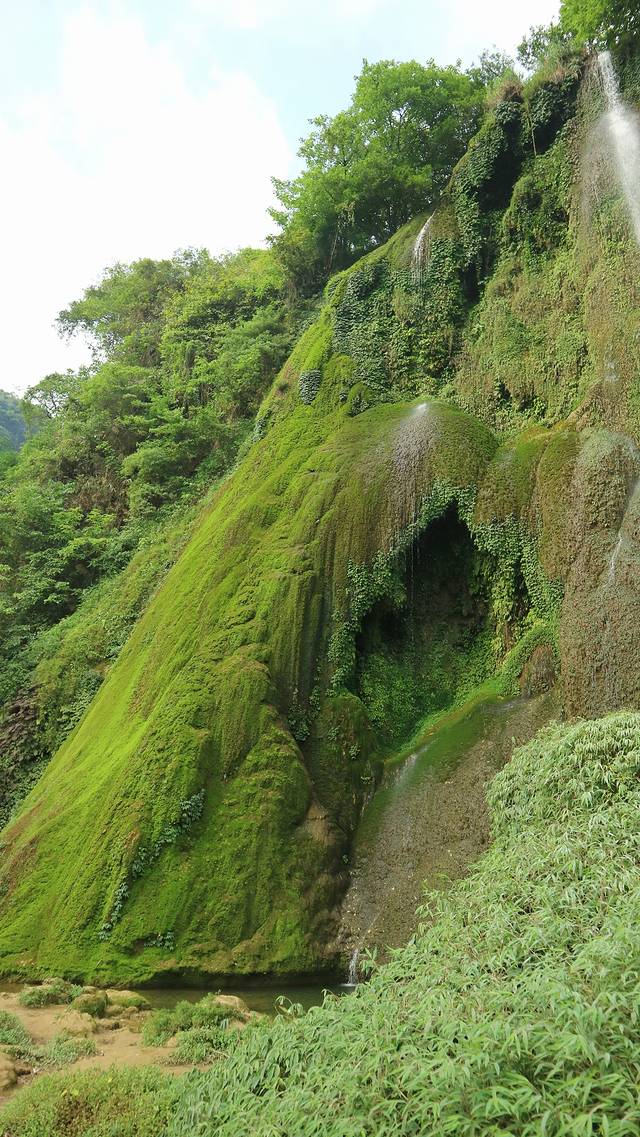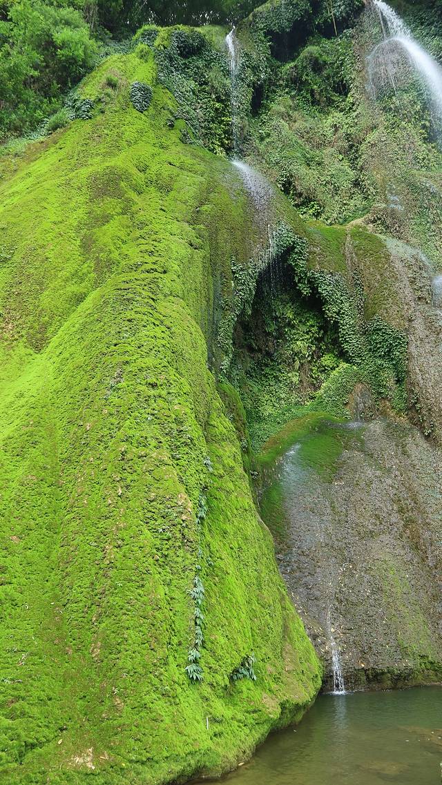 三叠岭瀑布由两部分组成,左半边是一个长满了青苔的石壁,另一侧是玉珠帘般的瀑布,亦动亦静,遥相呼应。