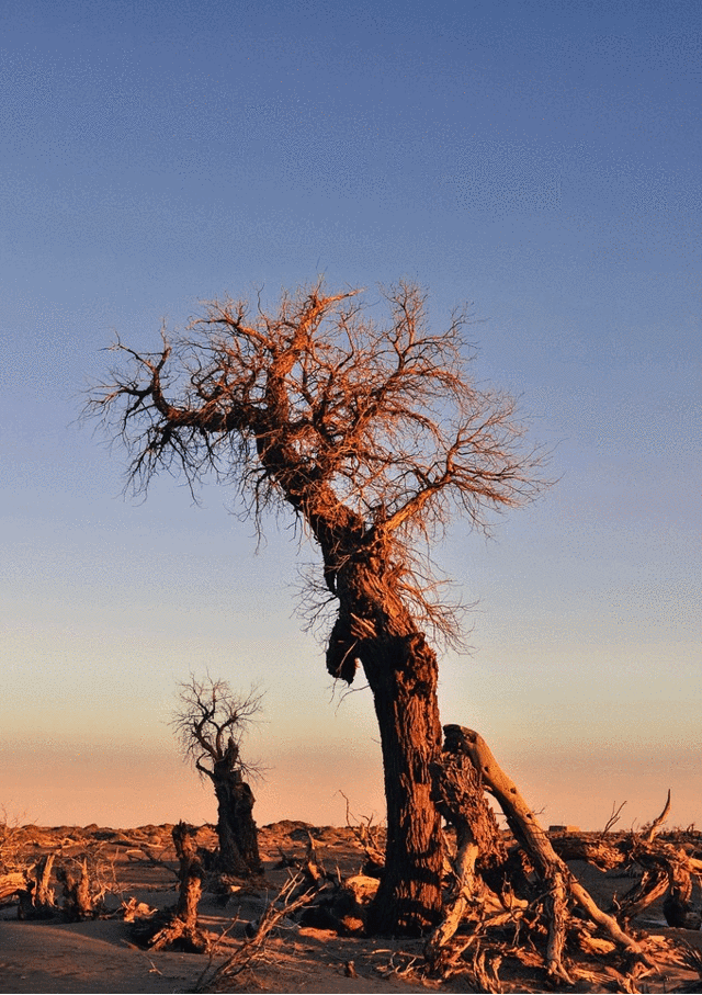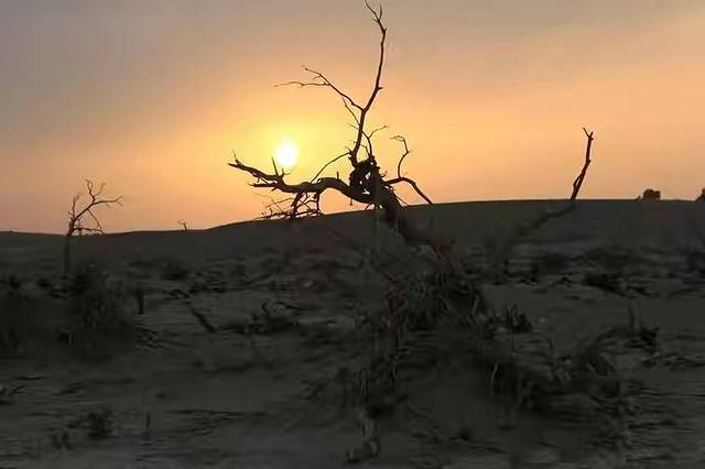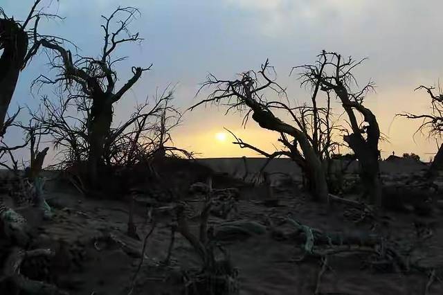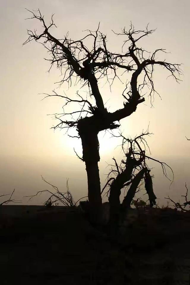 看到胡杨在夕阳下张牙舞爪