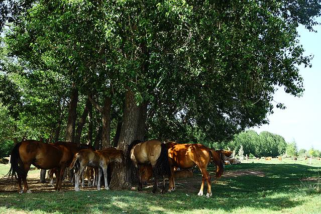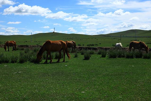 太仆寺旗的贡宝拉格牧场曾经有一眼著名的泉水,所以周围草场格外丰美,曾蓄养了十余万匹蒙古马供皇室和军队选用。历史走到今天牧区早已大范围缩减,游牧改为定居放牧,那个曾经辉煌的皇家御马场自然也风光随转。但是我们仍然能从草原上见到牧民骑着摩托追赶奔跑的马群,看到它们悠然吃草的样子,还在正午发现这些机灵的动物都钻进路边的树阴里躲避暴晒,而且一律是头朝里屁股朝外。圆润的臀部可爱得叫人真想在马屁股上拍一巴掌!