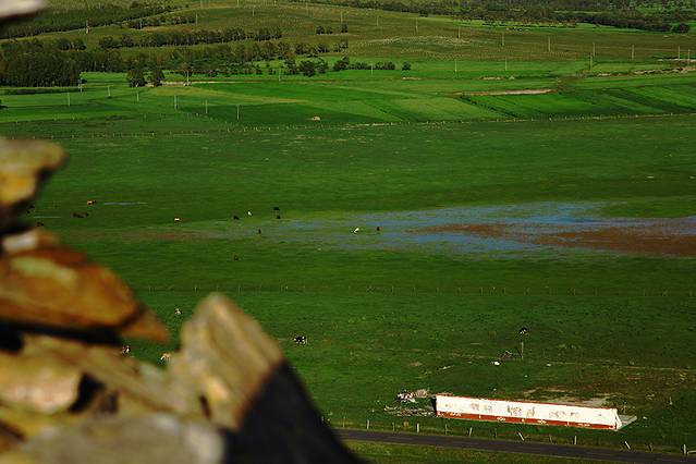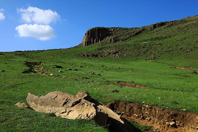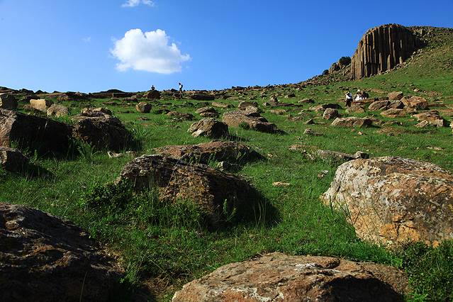 石条山也像昵称,但是没有正名。草原大地上隐藏着好多不为人知的秘密,比如这片山顶的石柱子,就是几亿年前的火山喷发造成的,那些熔岩在冷却后崩裂成许多六棱形的高如小山的巨大岩柱,是我第一次零距离触摸到的岩浆本尊。再往上爬,山坡全是巨大的石块,充当向导的原上彩虹店主的假小子给我们讲,这是整座山的石柱群随着时间一点一点崩塌收缩的结果。那很多年后,我们看到的石条山,是不是就更瘦了?呵呵