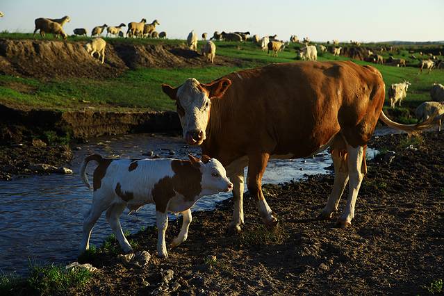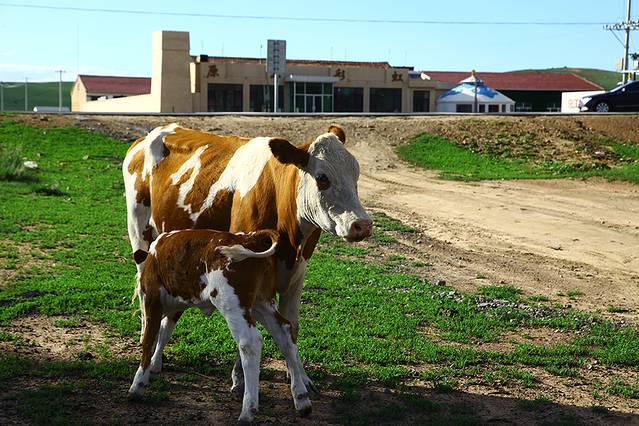 牛也是草原上最常见的动物,夏季随时会碰见正在吃奶的乳牛。太仆寺旗的红花牛好吃得出名,我们见到的果然多数是红白花纹。它们缓慢自在地溜达,没人管,晚上自己回家。我在想,牧民的日子是挺适意啊!从住的原上彩虹客栈走出来就是牧场,随处能见到牛羊,尤其那条小河边,总有成群的牲畜饮水,乘凉,玩。夕阳西下的时候,母牛带着小牛过河,身披金光,一幅其乐融融的图景。然而对牛和牧民有更深的理解,是在我们进行了牧户体验之后,后面我再讲。