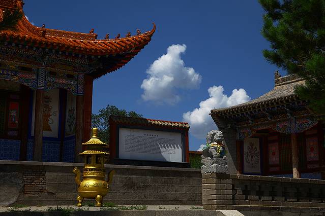 玛拉盖庙应该个昵称,帽子的意思,咸安寺才是它的正名。我们看到的这间藏传佛教的寺庙只有一座主殿两间侧殿,主殿里供奉着金光闪闪的三世佛。庙宇就建在草原深处的一片小小的湖水边,十足的圣洁感。你看到它很难想象这里曾经是整个内蒙三大庙之一,连蒙族的活佛都曾住锡在此。战火、文化更迭,历史上的天大的事,后人看来也不就是如此?