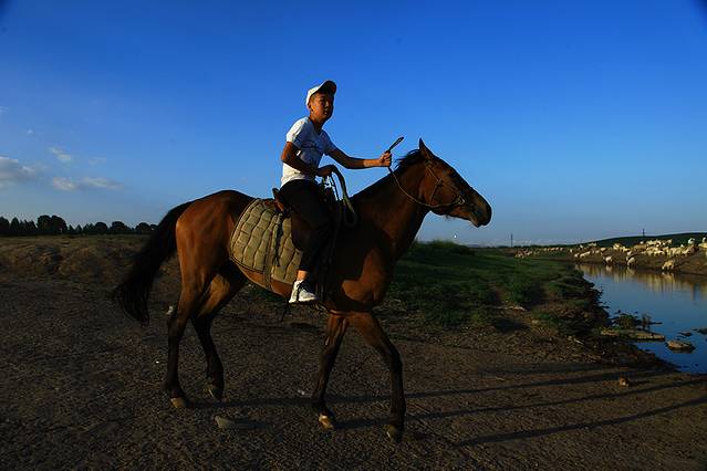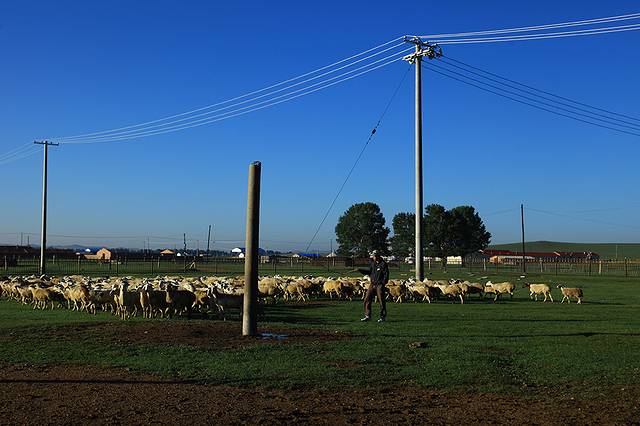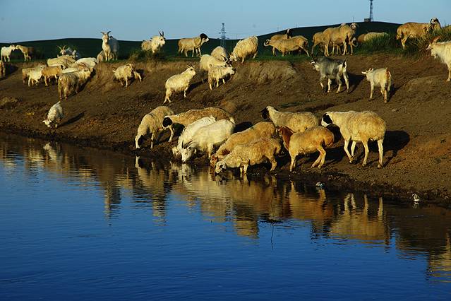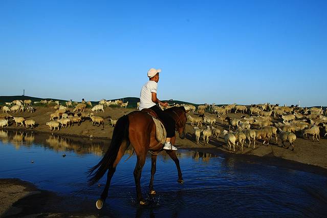 在水泥丛林住久了,牧民觉得“哪有什么好玩”的那些事物,都会拨动我们作为自然人的那一部分的觉醒。人吃晚饭前,羊群已经吃饱青草正从牧场上回来,聚在小河边喝水。哪见过这么多的羊!同事都激动得噤声了,一个个瞪着眼憋着嘴,怕吓跑了羊群。这时,背后传来哒哒的马蹄声,一回头只见一位蒙古少年纵马踏水,收拢羊群去了!那英姿飒爽的人马背影,意淫了多少草原壮丽的浪漫!