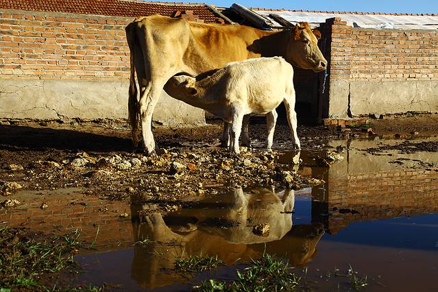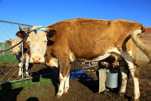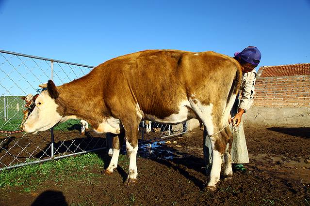 打井水喂牛后,准备挤奶。“要不是你们来,”牧民大哥的汉语说得挺好,“我们五点多就得把牛都放出去!不然这一天都吃不饱。”天刚擦亮就起来,原来也很辛苦。接下来我们跟着他来到牛栏,哺乳期的母牛和准备断奶的半大小牛是分栏住的,这会打开门牛犊赶紧跑向妈妈开始吸吮乳汁,嘴角吧嗒吧嗒地滴出浓白的奶来。才吃了几口,牧人上前拉开了它,原来吃奶是为了母牛顺利下奶。小牛被少年拉去旁边,委委屈屈地一直哞哞叫,老牧人穿上皮围裙,提上奶桶,先把牛的后腿绑上,就坐下开始挤奶。乳汁成一条白色的细线,一头牛能挤上一小桶。牧民说:“这是个辛苦活儿”,他们需要在五点多放牛出门前完成挤奶,通常是家里的女人做,挤一头牛大概用了十五分钟,他说手指非常酸痛。挤完奶,少年才放出半大小牛,把母牛的乳汁继续吃干净,这样它才好继续泌乳,也保证乳腺健康。牧民,了解牲畜的方方面面。