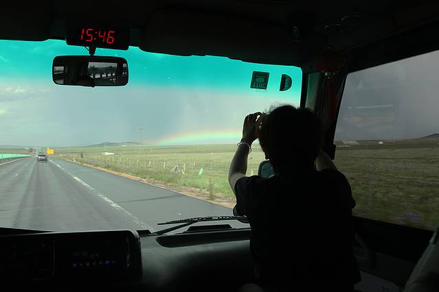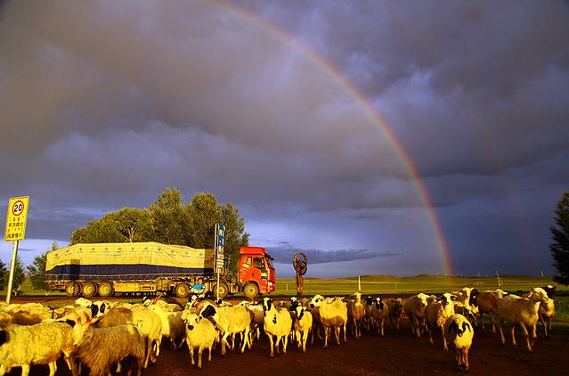 本有些懊恼,下午15:46开回原上彩虹客栈的路上,同事突然指着车外大喊“彩虹彩虹!”右前方一道平虹拔地闪耀在地平线上,美轮美奂!最精彩的是疾驰回到门口,正赶上雨要停,阳光斜射,牧羊人急急地冒雨赶着羊群,两道彩虹跨在天边!哦~草原,美得有点夺魂摄魄了!