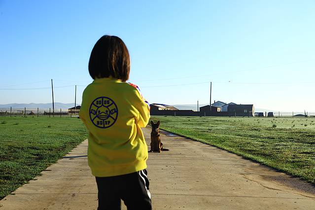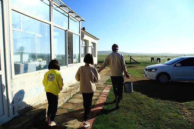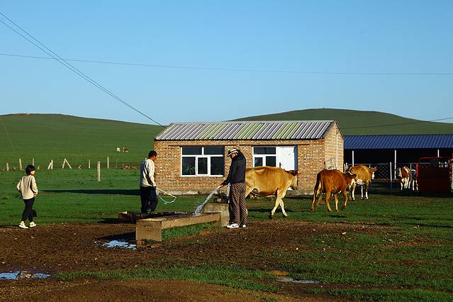 首先你要起得很早,六点才过,我们就跟着店主出发了,来到一公里外的牧民家。我后悔没慢跑过来,不过带的汪星人这几天可跑爽了。沿着嘎查里的道路往里走,遇见了村里原来的公用井台,店主给我讲牧民怎么打水,怎么直接让水流进石槽,牲畜可以直接饮用。我这才知道,草原上现在还没有自来水!通常每家或两三家有自己的水井。后来当牧民告诉我们他家直到90年代才通电,之前家家都点蜡烛或汽灯,八零后们瞬间觉得自己老得都石化了!