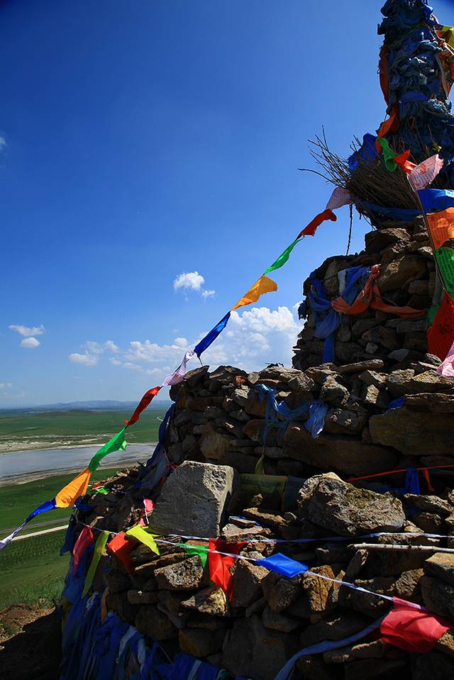 这个石头堆就是敖包,每年祭祀的时候牧民都要用石头重新整理和修缮它,再摆上祭品,献上哈达和经幡什么的。