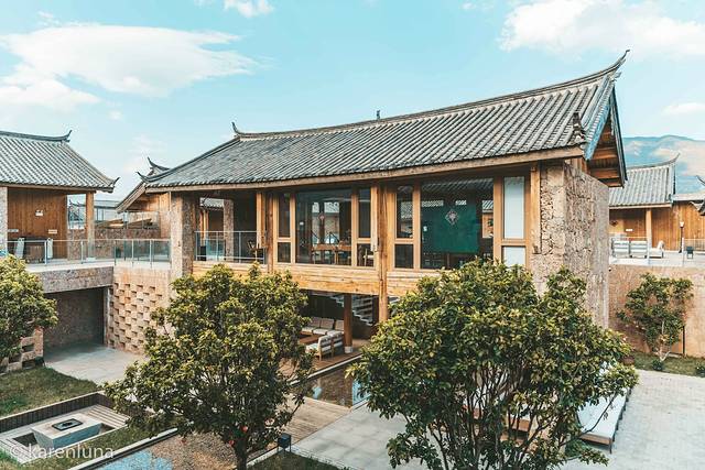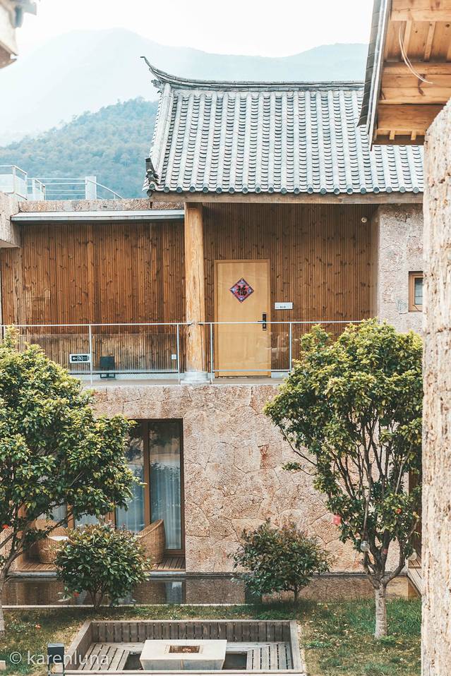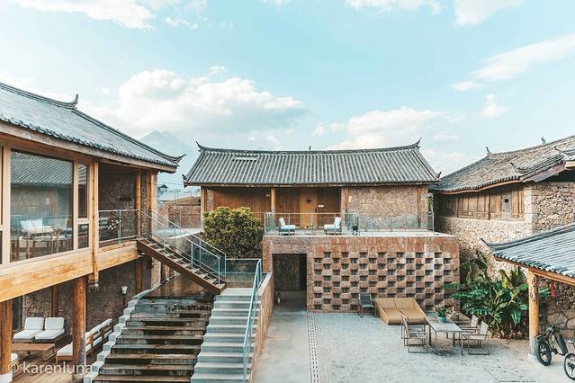 整个院子由日本设计师设计,将日本尊重自然的理念与纳西族民族特色元素相融合设计而成。以最具当地特色的石头房为主体,将坚硬的石墙、传统的木结构坡、以及用镂空五花石塑造出的“漂浮石墙”为院落主要结构,让人看上去既有纳西民宿的粗犷与淳朴,也有日式风格的细腻与简约。