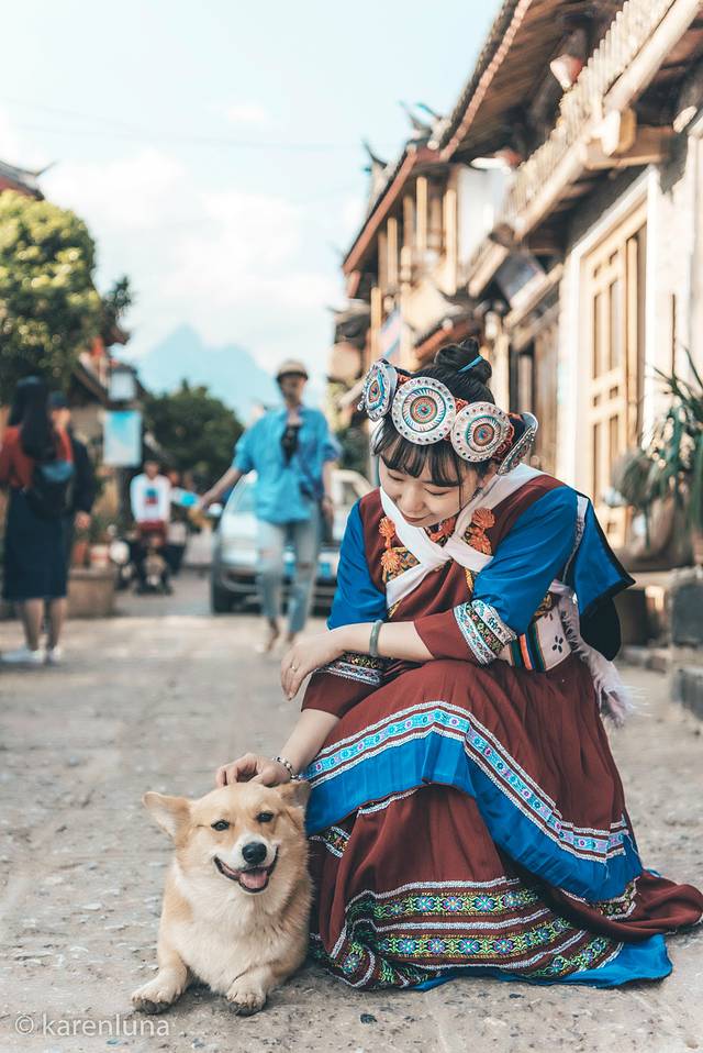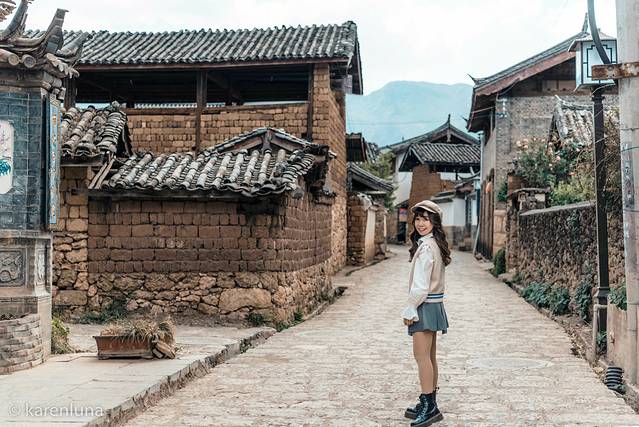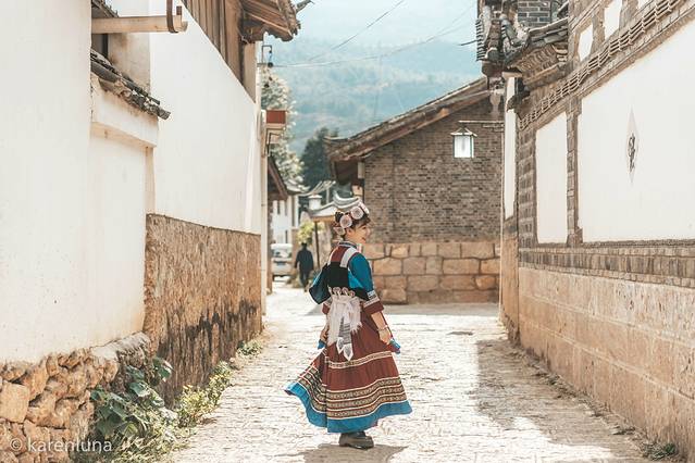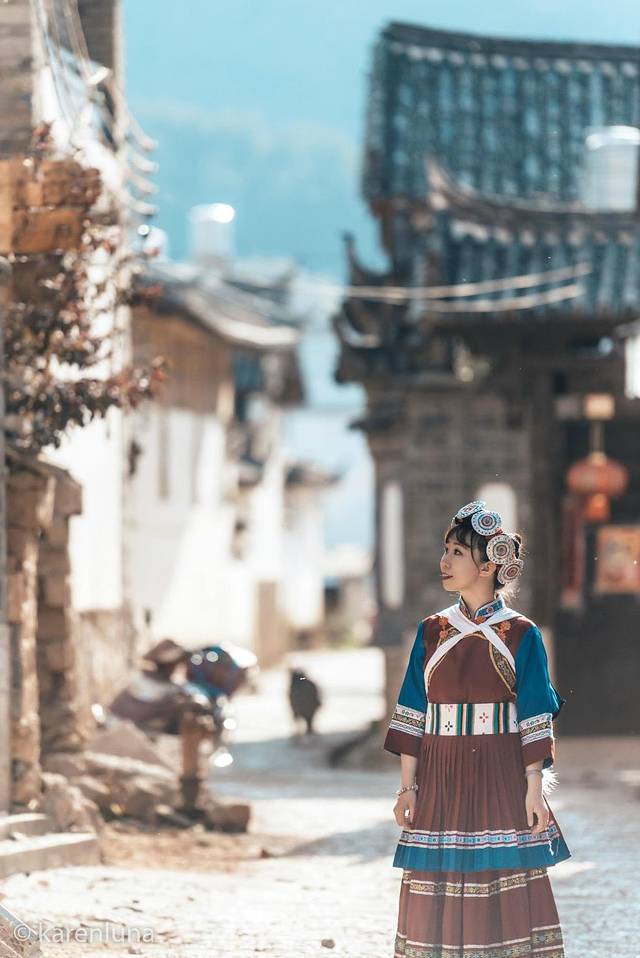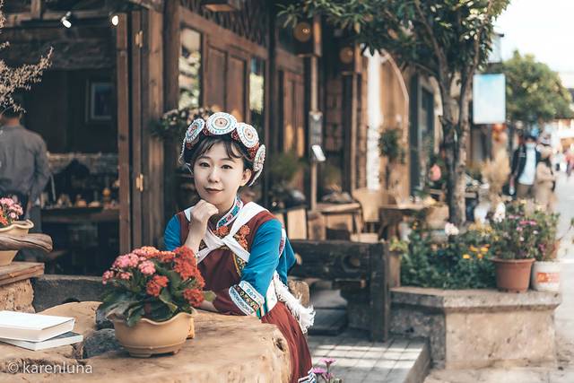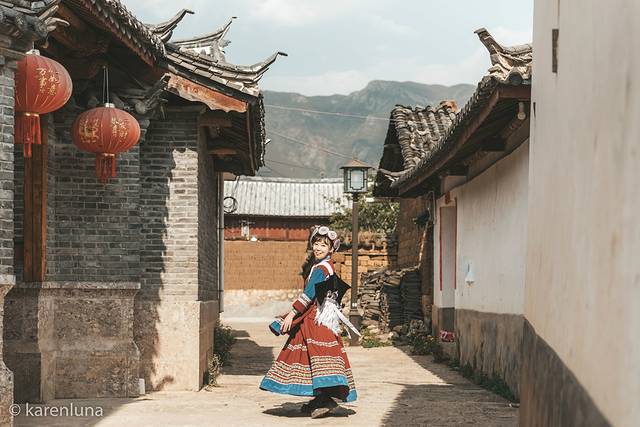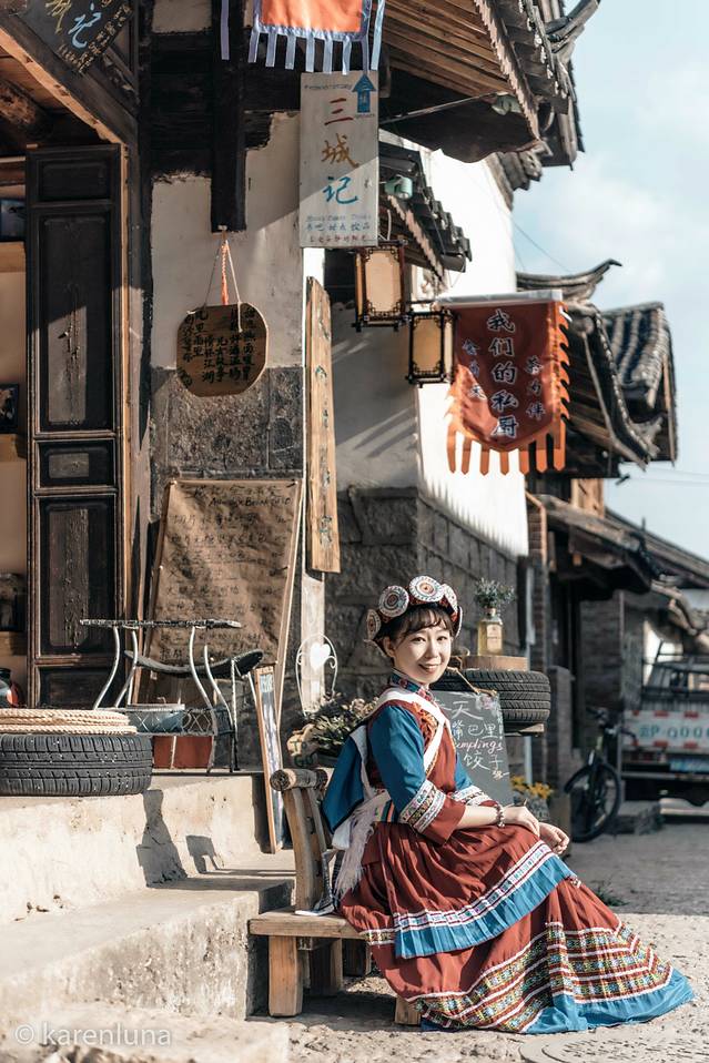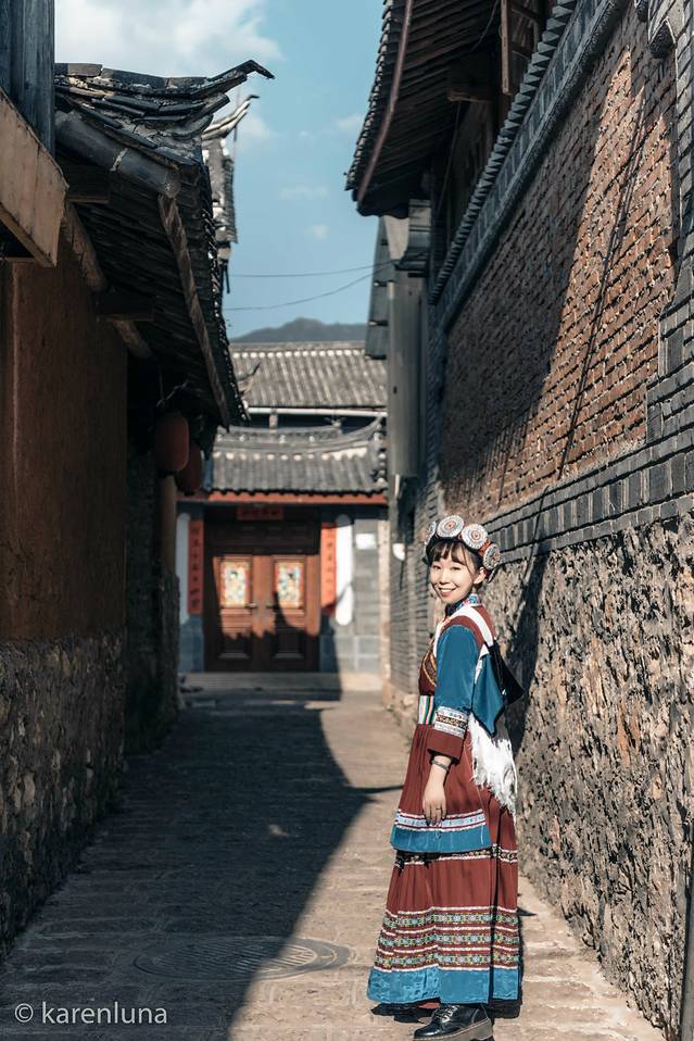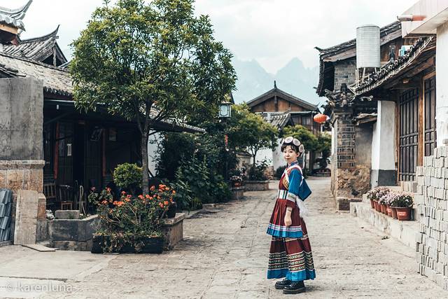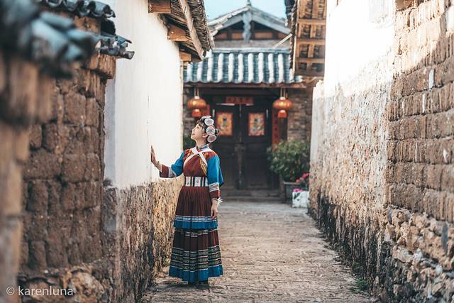 其实刚开始换上的时候并没觉得这身衣服有多好看,妈妈那尴尬又不失礼貌的微笑就说明了一切。但当拐进纳西族特色的石头房小巷里的时候,瞬间觉得很好看,简直就是大型真香现场。