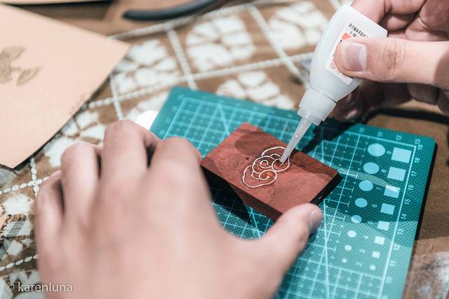这一步绝对是整个制作过程中最关键也是最难的。但银丝太细,想看清敲击时的每一步银丝位置是否完美事实不易,感觉自己都要钻进木牌里啦!不过慢工出细活儿,最后还是完美嵌入~