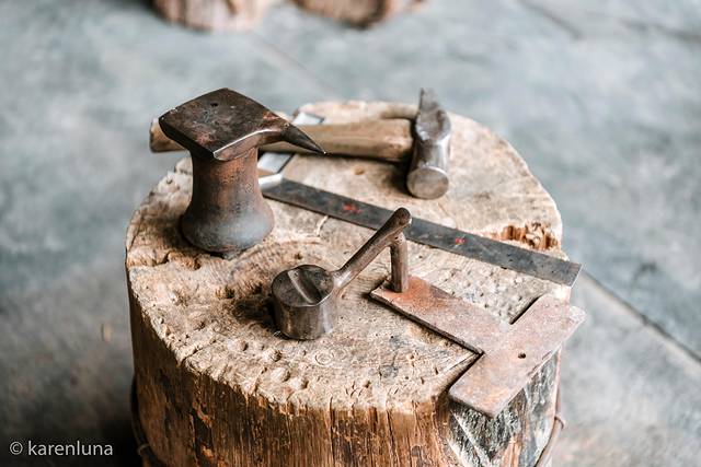 走进院子,只见不大的纳西传统小院中摆放了超多的打铁工具和正在制作的各种模样的铜器。而正在院子里敲打铜器的师傅见我们到来便放下手中的工具热情的迎接我们。通过简单的介绍才知道,原来眼前的这位就是丽江纳西族仅剩这“最后一个铜匠”、云南省省级非遗传承人和善均老师。