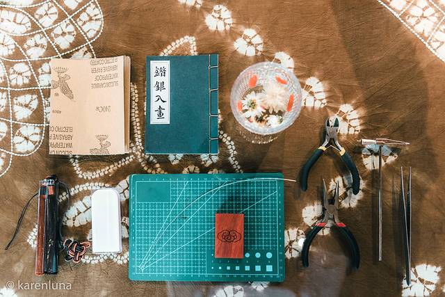 吃过晚饭来到酒店的活动中心,桌子上已经工工整整的摆放好了今晚要用的工具和材料。有了下午制作铜器的经验,晚上的错银入画便有了些期待与自信。