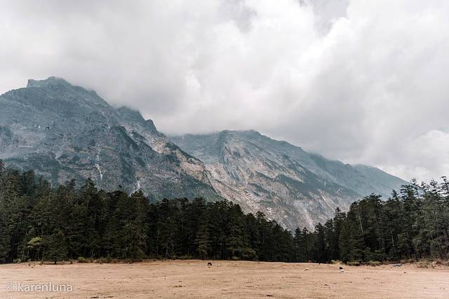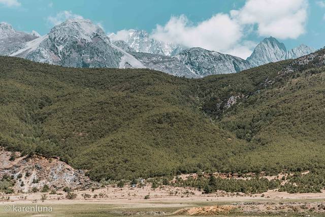 蓝天白云下的玉龙雪山仙气飘飘,高耸密布的云杉林在雄伟壮观的雪山映衬下显得渺小很多。阳光洒在还没有变绿的草甸上,看似虽有些荒凉,但空气中略带湿润晨露树香,却也给人一种幽静舒适之感。