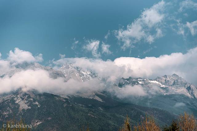 私家车出租车是不能开进玉龙雪山景区里的。在游客中心换乘山里的大巴车途经蓝月谷后终于来到了云杉坪索道入口处,而昨天还躲在云雾中的雪山,此时也终于若隐若现露出了他的真面目。