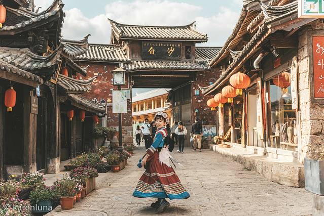 离开酒店的时候正赶上夕阳西下,古镇虽还是人潮涌动,但相比中午从麦田回来时已退去了不少。可能是纳西族服饰在这确实很搭,也有可能在这里变装的游客也不太多,漫步在古镇主街上,一个不注意就变成了别人相机中的风景。