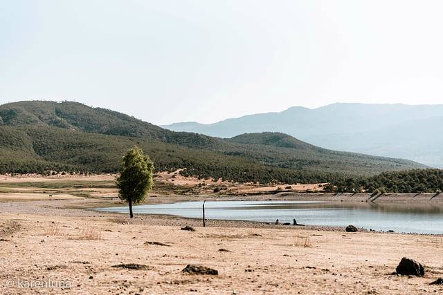 不过正值5月旱季,玉龙雪山上的雪日渐消失,覆盖量早已大不如从前,水库中的水因持续的艳阳天而褪去了不少,曾经在湖水中的那颗网红树如今也已经距离水边几米远了,很遗憾的少了些孤独的文艺感。