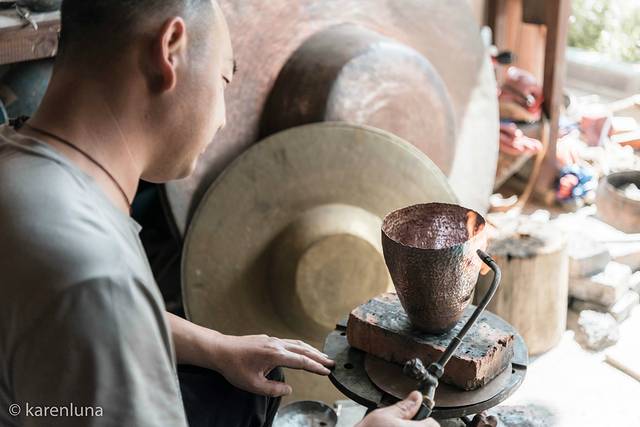 敲打铜器之前和善均老师先给我们介绍了丽江纳西族制作铜器的历史。原来这个打铁工艺可以追溯到汉代青铜兵器时代。明朝时木氏土司聘请中原的铜艺匠人将他们铜器制作技艺引入,而后又在清朝达到鼎盛。但随着现代工业制品的大量涌入,手工打制的铜器不断走向衰微直至今日,当初兴旺的铜器世家,如今在白沙仅剩和善均老师一家,他的徒弟也是寥寥数人,实在有些可惜。