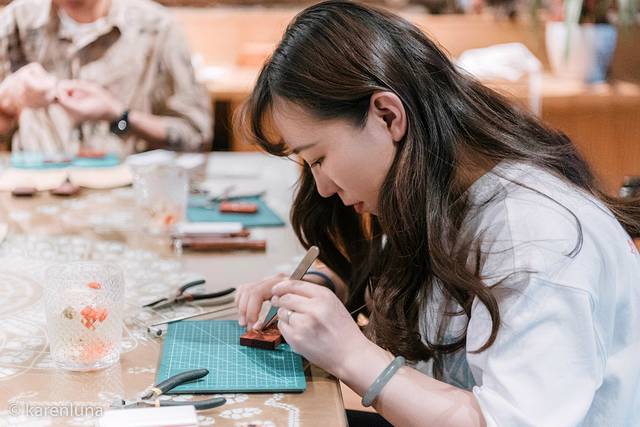 错银入画就是将细长的银丝通过小锤的敲击镶嵌到器具的表面,呈现出想要表达的图案或文字,让器具看上去更加优美庄重有灵魂。作为具有中国民族特色的装饰工艺,“错银入画”这种制作工艺被运用到了各个领域,而今晚我们要做的就是将银丝亲手嵌入一小块檀木做的无事牌中,将平安无事健康如意的美好祝福汇聚在其中。