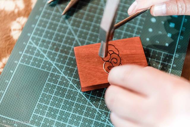 银丝是扁平的,所以敲击银丝时还要注意将银丝的薄面敲进木牌中,否则一旦敲歪,凹槽就会变大损坏,银丝就再也无法镶嵌其中了。