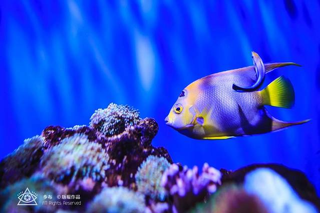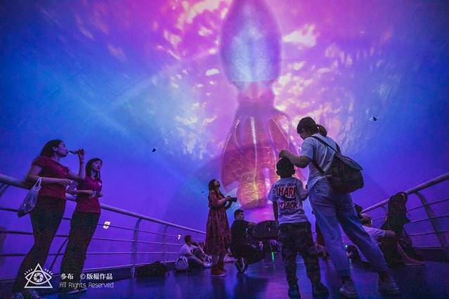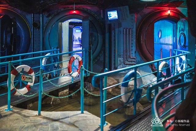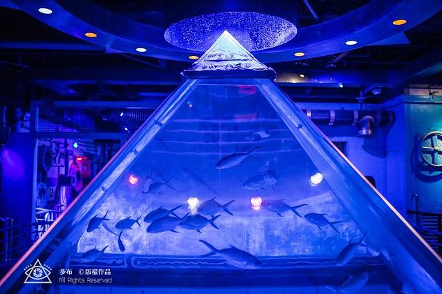 一走进海洋世界的大门,不光是身边游弋的鱼群,而是整个内部空间的细节,都在提醒我已经进入了海底深处。通道的设计如同船舱内部,穿过三道舱门,蓝幽幽的海底金字塔出现在面前,一场奇幻而浪漫的海底探险正式开启。