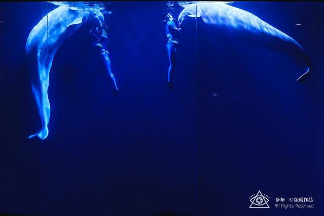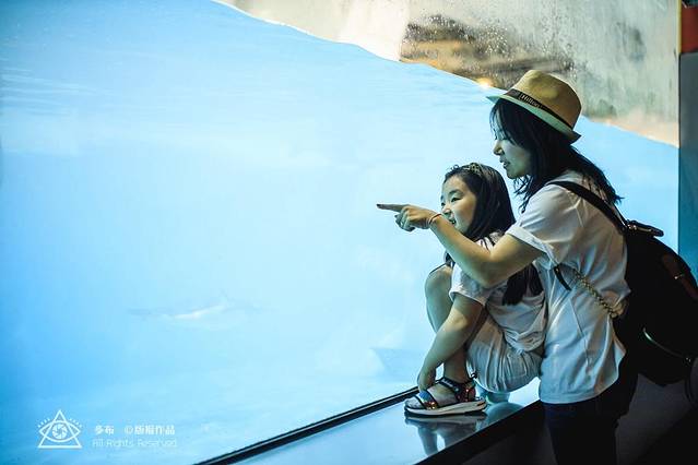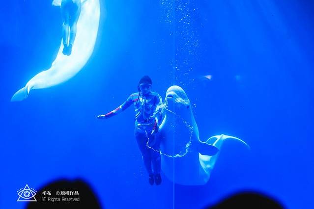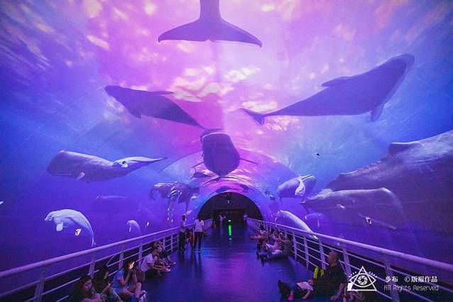 巨大的水缸周围,几排座位已经坐得满满当当,显然水下表演秀《白鲸传奇》的演出时间就快到了,如果像我一样喜欢拍照的话,其实站在最后一排的栏杆前就很好,视野一览无余,完全不会被前排的观众挡到。