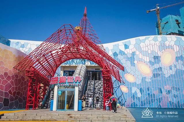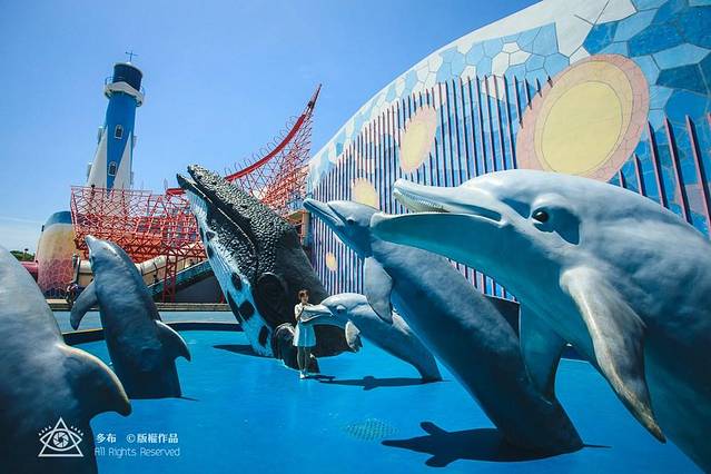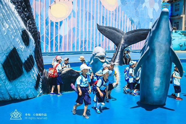 圣亚珊瑚世界是和海洋世界紧挨在一起的,馆外的广场上有巨大的鲨鱼和海豚雕塑,很多人在这里打卡拍照,只有幼儿园的一群小家伙们各自围着自己喜欢的鲸豚玩了起来,完全忘了老师让他们排队拍照留念这回事儿。