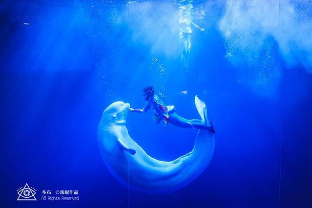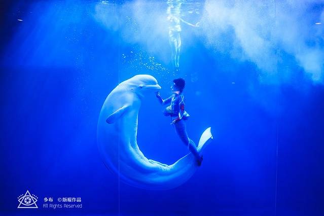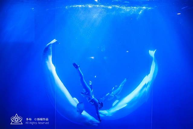 两位姑娘跃入水中,分别与一只白鲸组成CP,开始了默契的人鲸共舞。“白鲸骑士”、“水下华尔兹”、海底拼“心型”、人鲸大回环挑战、同步转体1080°……全水下的高难度表演,两位姑娘全程不戴气瓶,诠释震撼人心的美感与创意,演绎出一幅人与海洋动物和谐共处的奇妙图景。