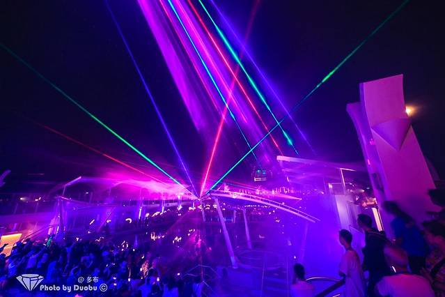 航程的最后一晚,船上大半的旅客都围在16层和17层的甲板,等着“星梦之夜”派对。这是世界梦号专属的海上电幻激光烟花秀。在此之前,甲板上主持人带着大家一起欢唱、跳舞。到了烟花秀开始的时刻,大家都难得地安静了一瞬间。然后,绚烂的烟火在夜空中绽开了,同时还有不同色彩变幻的3D激光交织在一起。