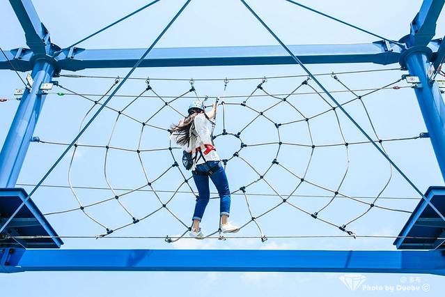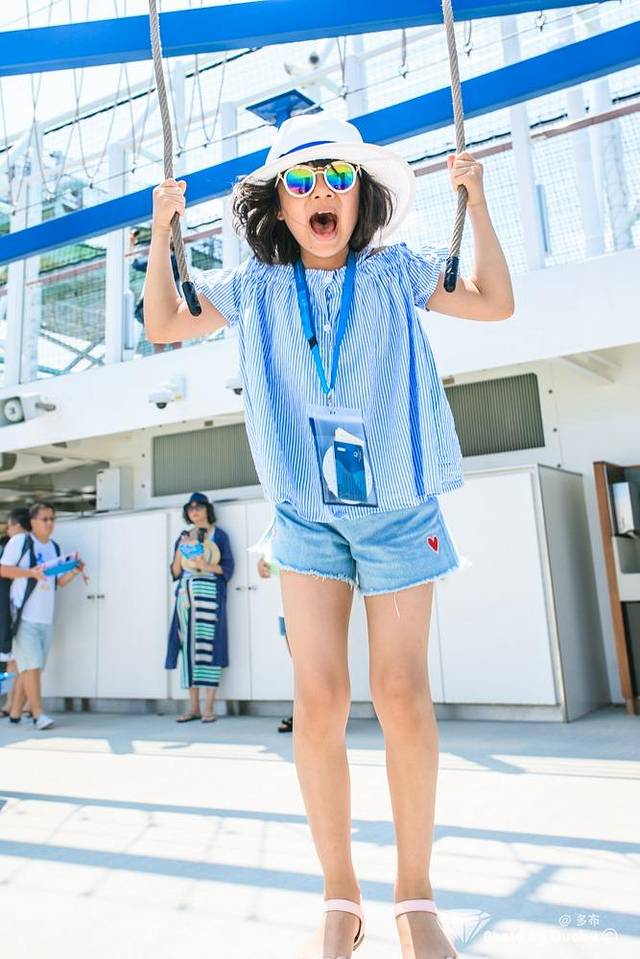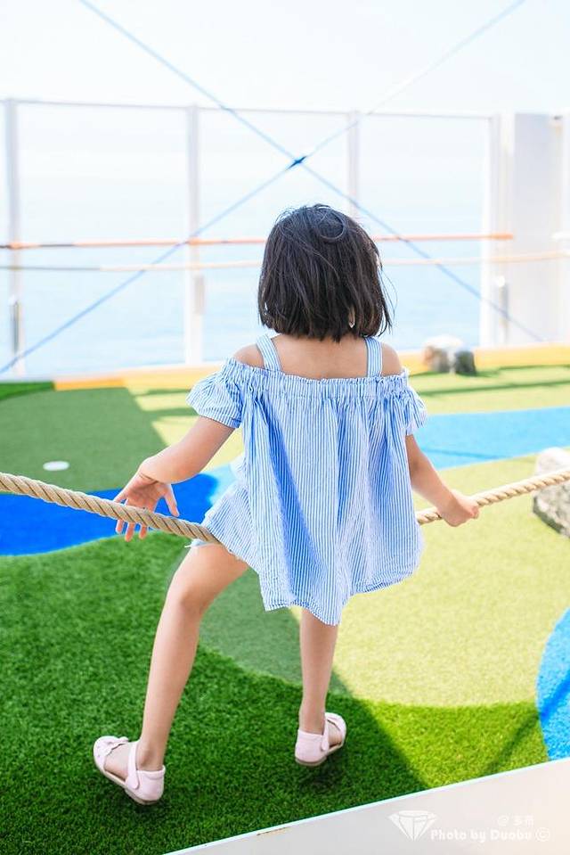 小孩子总是精力无限的,很快就被船上的户外运动体验给迷住了。室内外的攀岩都不少见,但海上拓展绳索场、攀岩墙还是第一次见识到。特别是绳索场,攀爬在18层的船体边缘,好像直接悬空在海与天之间,实在是超酷的!原本怕高胆小的布丁都跃跃欲试了起来,天天玩不够。