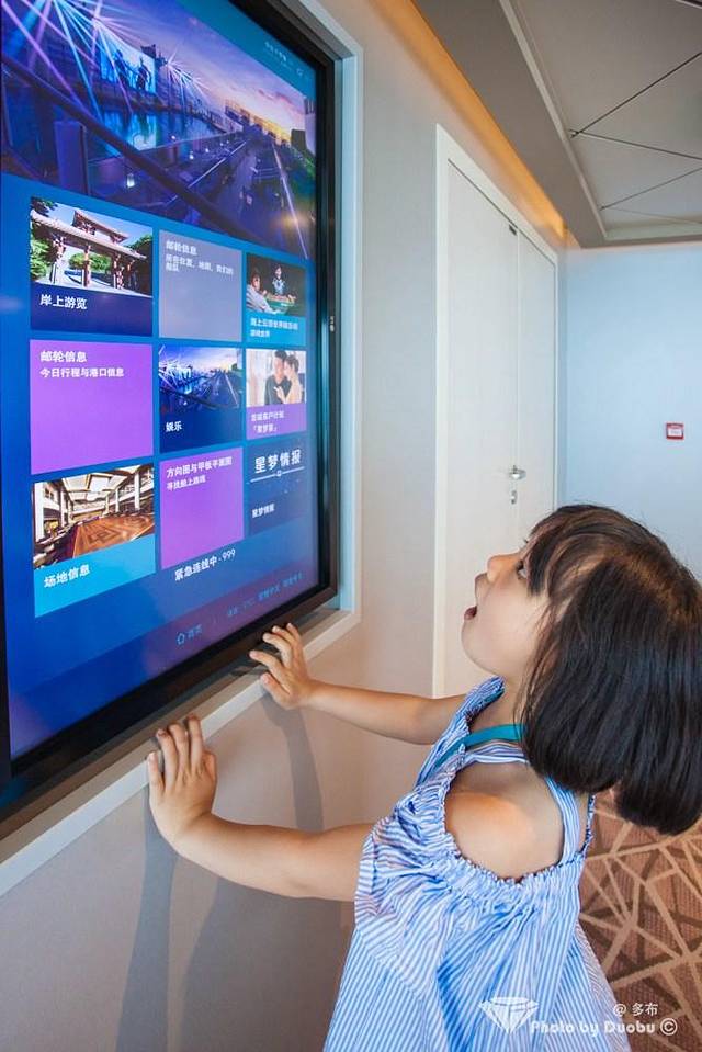 这艘有着18层甲板的“海上度假宫殿”实在太大啦。身为路痴的我一时有点眩晕。好在马上就发现船上公共区域有随处可见的触摸屏,可以指示位置和方向,小朋友也能轻松给我当向导。