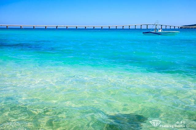 看过海角边的灯塔,下一站就踏上了与那覇前浜海滩——连续多年排名日本第一的最美海滩,脚下的白色沙子确实非常细软,白色沙滩边缘的海水如果冻一般,看起来比天空还浅些。海和天之间,远远看到得日本最长的免费跨海大桥——伊良部大桥。