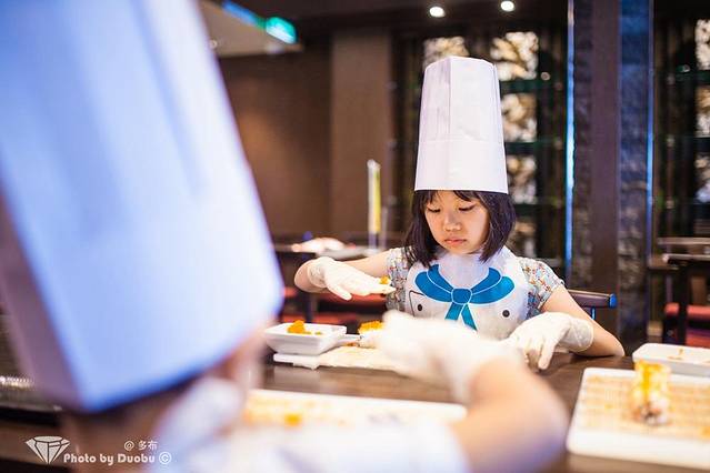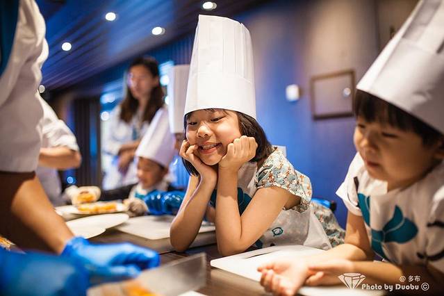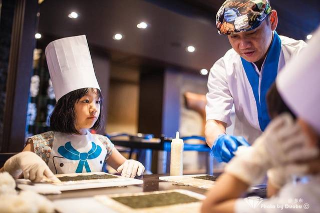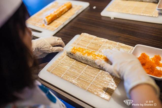 牵着在船上认识的小盆友,一起穿上萌萌的围裙,戴上专业的厨师高帽子,自己都忍不住笑起来。大厨先演示一遍,再指导着孩子们自己一层层铺好食材,再利用面前的竹帘一点点卷出美味的寿司。