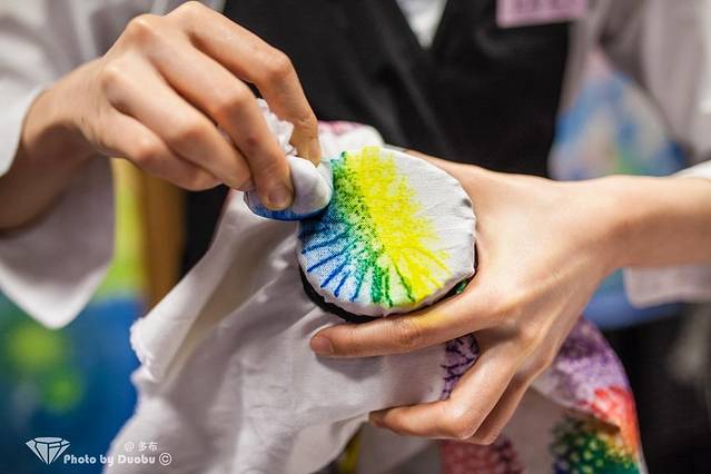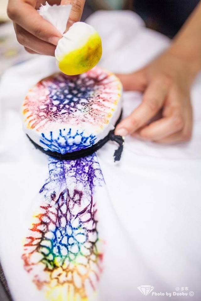 先把白布在珊瑚化石上绷紧,然后再用拓包沾上颜色在上面轻轻摩擦,布面上就呈现出珊瑚截面的彩色图案了。无论大人小孩都沉浸其中,每个人染出的图案与色彩都是世界上独一无二的!带回家就是最有意义的纪念品,送给别人则是最走心的伴手礼。