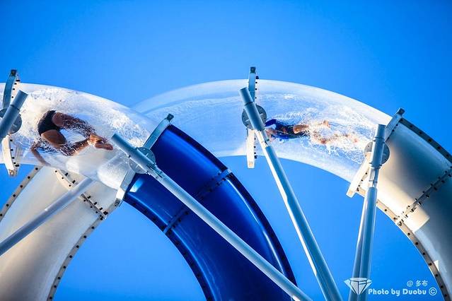 这个乐园里,高高低低的水上滑梯一共就有6条(5 条成人水上滑梯,1 条小童水上滑梯),飞驰在海洋上空,尽享高速滑落带来的极致快感。其中最高的一对封闭螺旋滑梯,高!曲折!刺激!最绝的是其中盘旋的部分是透明的,滑的人固然是感觉自己飞旋在半空中心跳加速,在下面的人抬头看,也真是够奇妙的风景。