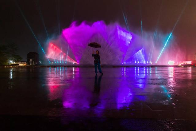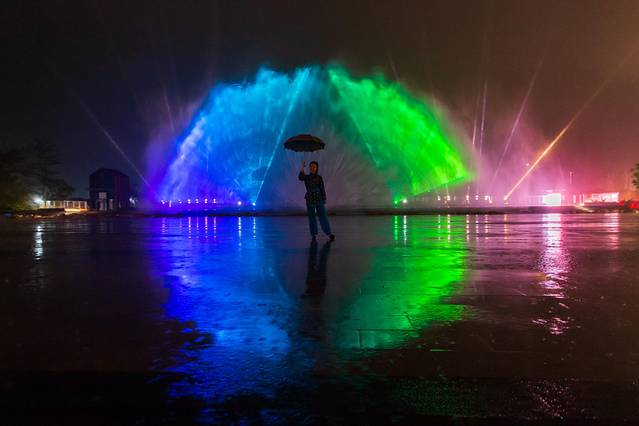 用罢美味的新长征宴后,时间刚好,赶上新长征广场上的大型红色水幕电影表演。虽然天上下起了大雨,但五彩斑斓的灯光照射在水幕上、雨幕中,别有一般美轮美奂。