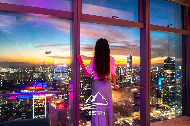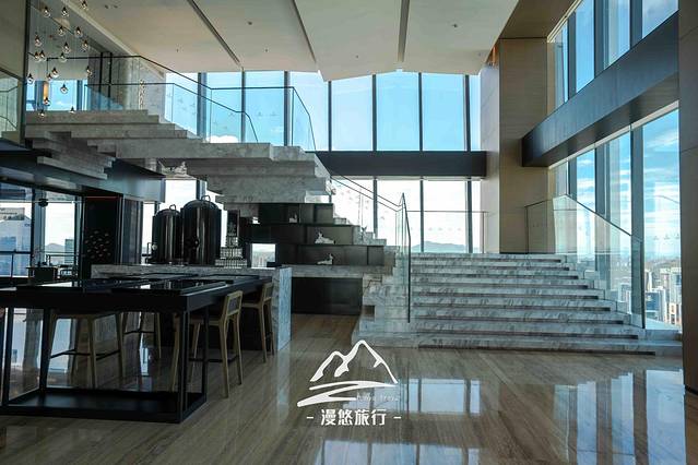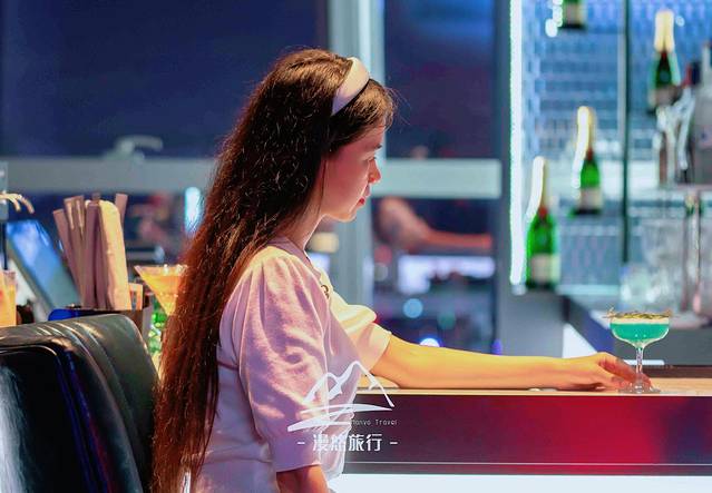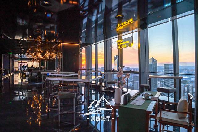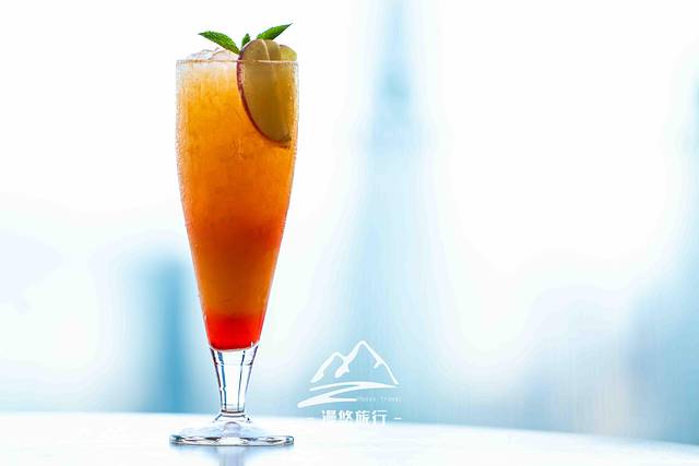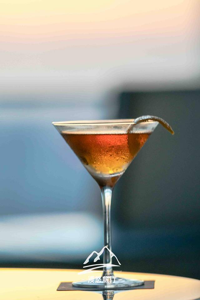 去往观景台,逸庭吧是必经之地,只见窗外的天空已被染成了红黄相接的色块,像是一团燃烧着的烈火……这烈火和室内璀璨的灯光相互辉映,又各自美丽。抬头一看的刹那,惊艳了眼眸,也温柔了我的心。如果以眼前景致为灵感创作一杯鸡尾酒,该取什么名字好呢,夕颜?燃烧的心?醉夕阳?
