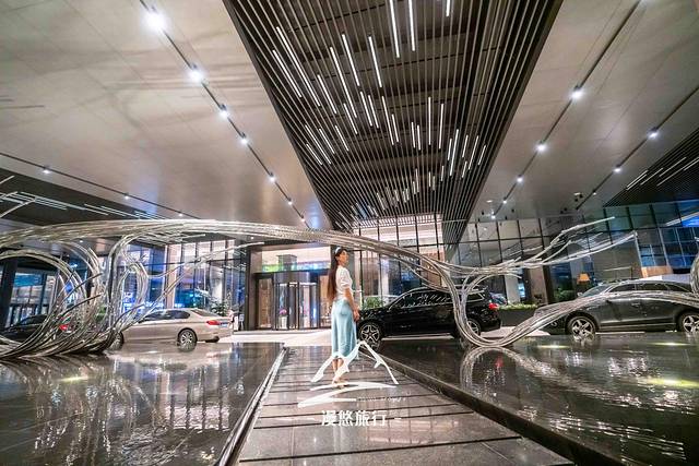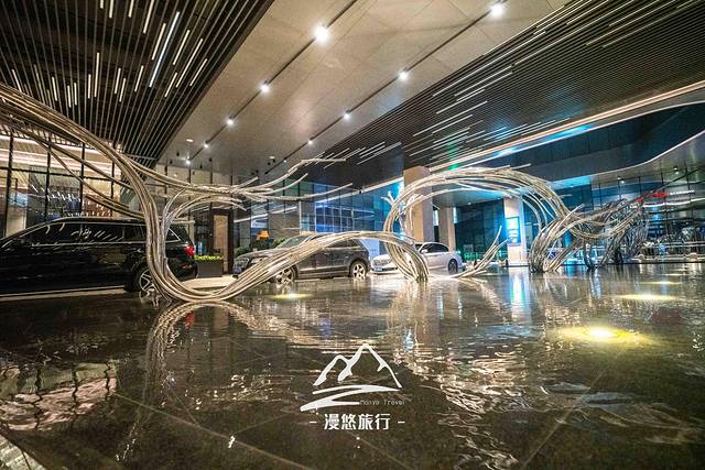 震撼从大门口的装置艺术开始,波光粼粼的水面,抽象化又极具曲线美的钢结构,一柔一刚相互映衬。