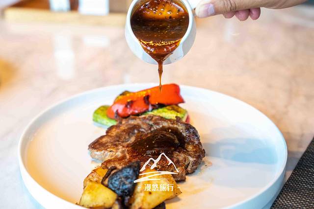 午餐是半自助的形式,198元的套餐里面含一道主食,谷饲带骨肉眼和波士顿龙虾意面,二选一噢。谷饲带骨肉眼肋排肉位于牛身侧壁部位,纹路细腻,拥有漂亮的大理石花纹和像里脊一样细腻的肉质。用这个肋排肉煎的牛排味道真是棒极了,肉质柔软,多汁且浓厚,还有记得一定要配上酱汁,她可以让牛排好吃程度更上一层楼。