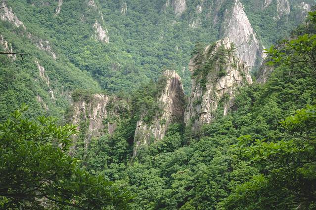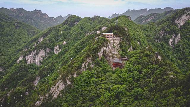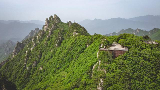 到了索道终点,刚走出出口,就瞬间被眼前的山景震撼到!正前方的远处就是主峰犄角尖,海拔两千多米,是群峰之最。