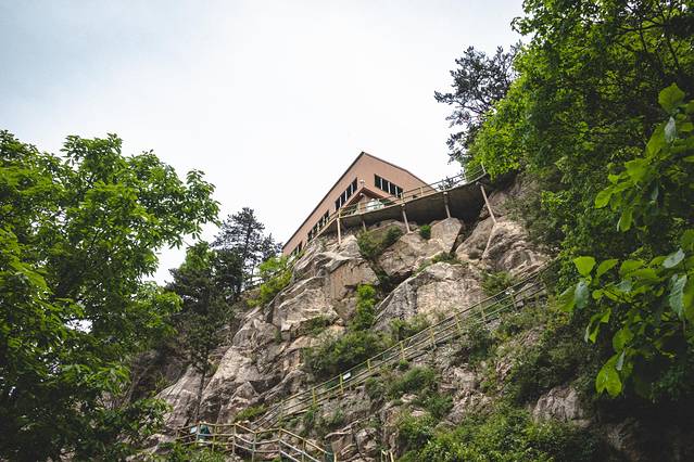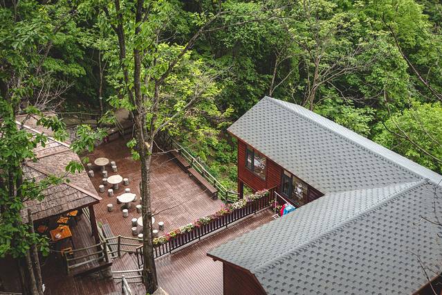 咖啡馆位置就在索道上山后的正下方,走山道5分钟就能到。