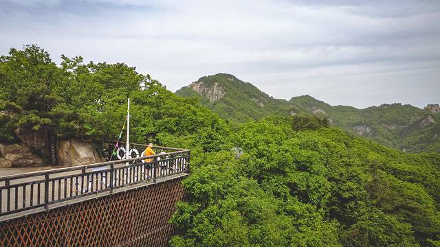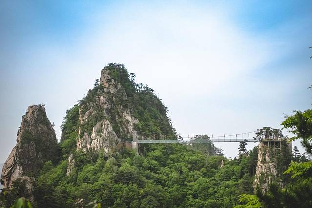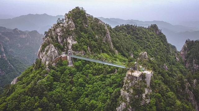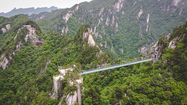 当然老界岭也有一处各种山岭都有的惊险刺激的网红玻璃桥,这个横跨在两座山峰之间的玻璃桥远看就觉得很是惊险。站在桥上也能看到桥下山道上爬山的游客。
