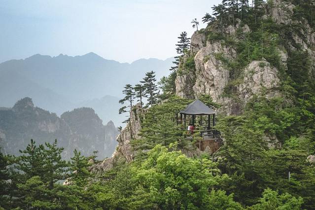 为什么叫犄角尖,因为山峰远看着像昂首高歌的雄鸡而闻名。就在山间的顶部远看过去还有一座亭子。而迎客松恰好也是对着犄角尖的方向,像是在互相打招呼一样。